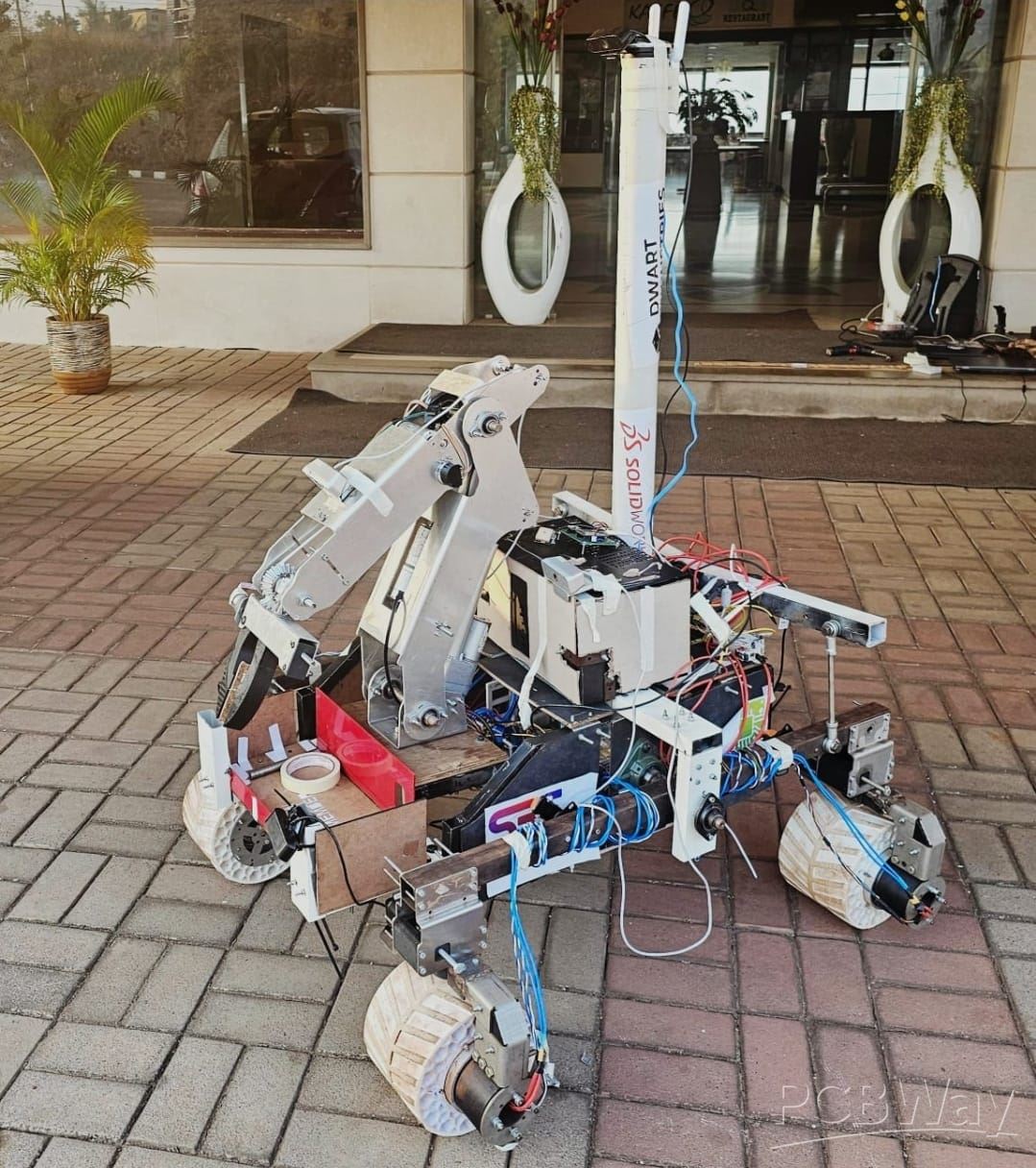 An Arduino Due along with an ESP32 are used to control a rover’s drive system. Four planetary geared DC motors equipped with Hall effect sensors for accurate speed and position feedback control the main motion. This arrangement allows the rover to achieve smooth acceleration and precise speed control. Additionally, the rover features a pivot steering mechanism driven by 4 NEMA-17 stepper motors, which provide high positional accuracy and controlled maneuverability. Limit switches have been installed at the end of each pivot to prevent over rotation. They work by detecting when a motor hits the limits and sends a feedback signal to the MCU to stop motor rotation. All motors are managed by MDD10A dual-channelled DC motor drivers.