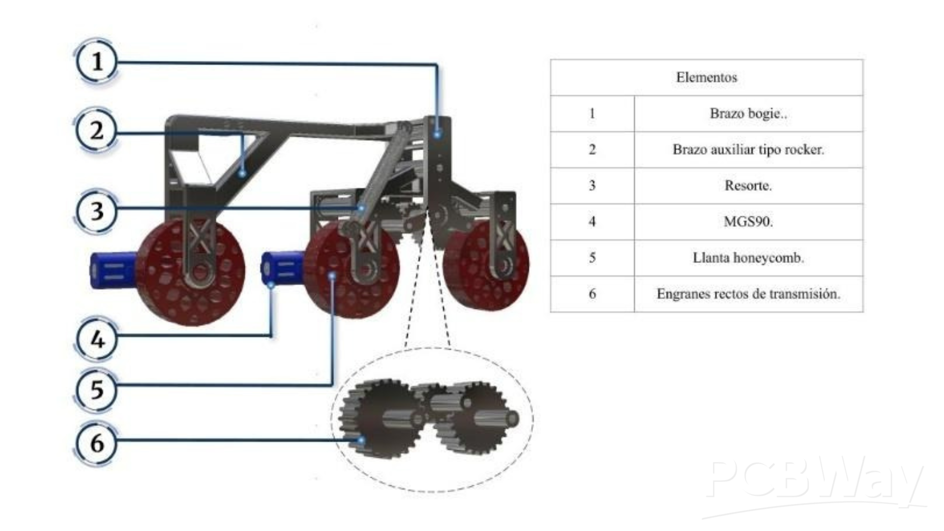Suspension: The mechanism responsible for absorbing uneven terrain and maintaining the rover's stability. It was designed to adapt to different mission conditions, ensuring even load distribution and constant wheel contact with the surface.